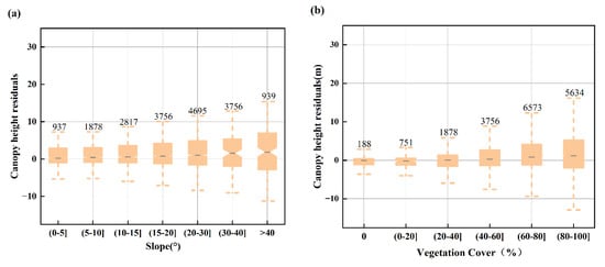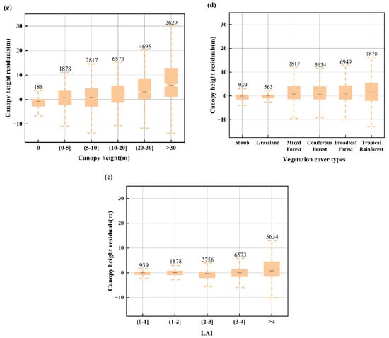 ICESat-2 canopy height residuals (relative to LiCHy LiDAR data) with varying environmental factors: (a) slope, (b) vegetation cover percentage, (c) canopy height, (d) vegetation cover type, and (e) LAI.