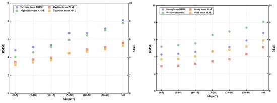 The effects of beam strength (strong vs. weak) and data acquisition time (day vs. night) on terrain height accuracy were examined under eight distinct scenarios, with detailed metrics summarized in Table 2. Beam strength was identified as the primary factor affecting accuracy. As shown in Table 2, strong beams yielded significantly higher accuracy than weak beams, with RMSE and MAE reduced by 53.6% and 55.3%, respectively. This substantial improvement is mainly attributed to the higher photon flux of strong beams, which enhances their ability to penetrate vegetation and detect ground returns.