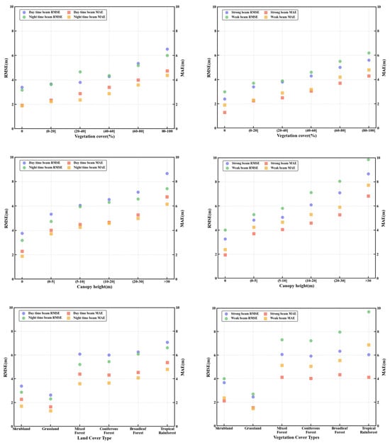 The scatter plot in Figure 12 further reveals the differential effects of vegetation types under various observational conditions. Tropical rainforest areas exhibit the highest RMSE values (reaching 9.7 m under weak-beam conditions), while grassland areas show the lowest RMSE (only 2.3 m for nighttime measurements). Notably, although coniferous and broadleaf forests in the study area have similar average heights (23.7 m and 24.2 m, respectively), the MAE value for coniferous forests (4.0 m) is significantly lower than for broadleaf forests. This difference is attributed to the conical structure of coniferous forests forming relatively regular “collimated transmission channels”, enabling more photons to directly reach the ground and return. In contrast, the irregular leaf arrangement in broadleaf forests leads to enhanced isotropic scattering, reducing the detection probability of ground photons [,], particularly under weak-beam conditions. The impact of these structural differences on photon transport has been predicted in theoretical models [], and this study provides empirical support based on field-measured data.