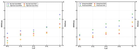 Vegetation density and measurement accuracy exhibit a non-linear relationship: daytime and nighttime observation RMSE values in areas without vegetation are 0.8 m and 1.2 m, respectively. Within the vegetation coverage range of 20–80%, both daytime and nighttime observation RMSE are maintained at approximately 2.5 m, indicating that observation time has limited impact on measurement accuracy under moderate vegetation conditions. This non-linear relationship reflects the complex modulation effect of vegetation on laser signals, with low-density vegetation mainly weakening signals through scattering, while high-density vegetation may completely block some signals from reaching the ground. LAI analysis shows that RMSE values increase with increasing LAI, and within the lower LAI range (2–3), this relationship is relatively gradual, indicating that within a certain threshold, laser systems can still effectively compensate for signal attenuation caused by vegetation.