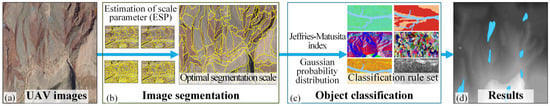 The surface coverage at a site can be destroyed by the occurrence of landslides, which could be inferred from the discontinuities of the surface coverage in UAV images. In general, the discontinuities of the surface coverage caused by landslide occurrences can be categorized into three aspects: spectral, texture, and shape [21,30,31]. For example, the surface reflectance at landslide sites is strong and the color tone is light due to the loose material composition caused by the landslide deformation [32]. Note that the changes in the shape and color of the surface coverage caused by a landslide can vary spatially [33]; thus, the texture, which indicates the change frequency of the color in an image, can be fairly irregular at a landslide site. Further, the landslide area usually shows special plane shapes such as armchair and ellipse [34]. The spectral, texture, and shape features in UAV images can be well clustered in object-oriented image analysis [35,36]. Hence, an object-oriented image analysis is adopted in this paper to recognize the landslide area and boundaries in the UAV images. The basic purpose of the object-oriented image analysis is to cluster the pixels in an image with high homogeneity into basic objects, based upon analysis of the spectral, texture and other features, and recognize the target based on the classification of the clustered basic objects. There exist two main components, as depicted in Figure 2.