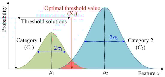 Here, P(x) denotes the probability of a feature x; P(x|C1) and P(x|C2) are the probabilities of the feature x that belong to object categories, C1 and C2, respectively; and P(C1) and P(C2) are the probabilities of object categories C1 and C2, respectively. Note that the mixture or intersection between the two object categories C1 and C2 yields the least when P(x|C1) = P(x|C2), and the corresponding eigenvalue is X1; thus, this eigenvalue X1 can be taken as the optimal threshold value of the feature x for separating object categories C1 and C2 (see Figure 3).