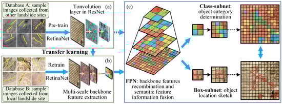 For ease of applying the aforementioned deep transfer learning strategy, two databases of sample images should be established: Database A, which represents the sample images (containing ground surface cracks and non-ground surface cracks) collected from the other sites, and Database B, which represents the sample images collected from the local site or study area. The image selection criteria for Database A should adhere to the following principles: to capture common characteristics of ground surface cracks across diverse scenarios, priority should be given to ensuring variability in geological conditions, crack typologies, and environmental configurations, thereby enabling the model to learn fundamental features of cracks across broad contexts (see Figure 4a). Image resolution should maintain reasonable consistency to guarantee clearly visible morphological characteristics of cracks, ensuring effective learning of visual patterns associated with ground surface cracks. It should be emphasized that the primary objective of Database A is to provide the model with comprehensive foundational knowledge of general crack features. Subsequently, site-specific characteristics of ground surface cracks, influenced by local geological conditions and triggering factors, can only be derived from Database B, which captures unique attributes of the study area (see Figure 4b). Through coordinated utilization of both databases, the deep transfer learning strategy facilitates effective integration of universal and localized crack features, ultimately enhancing recognition accuracy through this complementary dual-database architecture. Within the context of the adopted deep transfer learning strategy, Database A is adopted to pre-train the image recognition model using RetinaNet. This pre-training results in the preliminary backbone feature extraction networks (known as ResNet) for ground surface cracks. Then, the basic feature layers in ResNet such as combination mode and spatial distribution probability are retained; meanwhile, the redundant information is removed. Finally, the sample images collected from the concerned site, the size of which is often small, and the processed ResNet are imported to the platform and re-trained utilizing RetinaNet; the outcome is an improved ground surface crack recognition model (see Figure 4c).