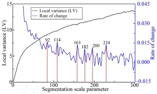 The accuracy of feature extraction and object classification can be strongly affected by the quality of image segmentation [37]; thus, the following criteria are usually followed during the image segmentation: a basic object should be composed of the pixels with similar spectral, texture, and other features; meanwhile, there are significant differences between different objects [38]. In other words, a high-quality image segmentation should maximize the homogeneity within each object while maximizing the heterogeneity between different objects. However, in high-resolution UAV imagery, smaller Ground Sampling Distance (GSD) may exacerbate internal heterogeneity of ground objects, posing challenges to achieving ideal uniformity. Further, there exist various types of ground objects in a UAV image, and their sizes and internal complexities can differ significantly. To address these issues, the multi-scale segmentation method [39] is utilized in this paper to balance the trade-offs between over-segmentation (excessive fragmentation under small scales) and under-segmentation (pseudo-pixel aggregation under large scales) caused by high-resolution GSD. The segmentation results in multi-scale frameworks critically relying on the segmentation scale parameter. For instance, a small segmentation scale parameter tends to generate fragmented objects, particularly in high-GSD images where noise and fine textures dominate; conversely, a large-scale parameter may mask critical boundaries, especially for spectrally similar but structurally distinct objects. An optimal segmentation scale parameter must ensure both boundary clarity and semantic coherence of objects, which is particularly vital for applications like landslide mapping requiring precise contour extraction. To avoid the arbitrariness of conventional trial-and-error analysis, this paper adopts the Estimation of Scale Parameter (ESP) tool [40]. The ESP algorithm quantifies the local variance (LV) and rate of change (ROC) heterogeneity metrics, enabling data-driven optimization of scale parameters while accounting for the inherent heterogeneity challenges in high-resolution UAV imagery.