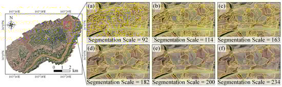 Segmentation results obtained with these six candidate optimal segmentation scales: (a) segmentation scale = 92; (b) segmentation scale = 114; (c) segmentation scale = 163; (d) segmentation scale = 182; (e) segmentation scale = 200; (f) segmentation scale = 234.