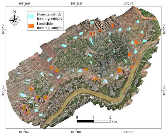 Building upon the image segmentation that has been completed, this paper employs the SEaTH method detailed in Section 2.2 to identify the salient features for object classification and their corresponding thresholds. Accordingly, a total of 20 landslide object areas and 40 non-landslide object areas are randomly selected from the study area. Figure 9 depicts the distribution of these sample images. The random selection of samples is intended to ensure representativeness and diversity while also considering areas with patterns or properties that could be confused with landslide features to enhance the model’s robustness. Among these sample images, the landslide objects are obtained through visual interpretations of the DOM generated and confirmed by field surveys while the non-landslide objects including the building, road, vegetation, ground, and bedrock are obtained with visual interpretations. According to the previous studies in this area and the prior knowledge on landslide recognitions [43,60,61,64], a total of 47 candidate features, as tabulated in Table 2, have been preliminarily selected for separating the landslide and non-landslide objects. Based on the results of the feature analysis of the sample images with the algorithm of SEaTH, 14 prominent features can be obtained, as tabulated in Table 3. Also provided in Table 3 are the threshold values of these prominent features for separating the landslide and non-landslide objects.