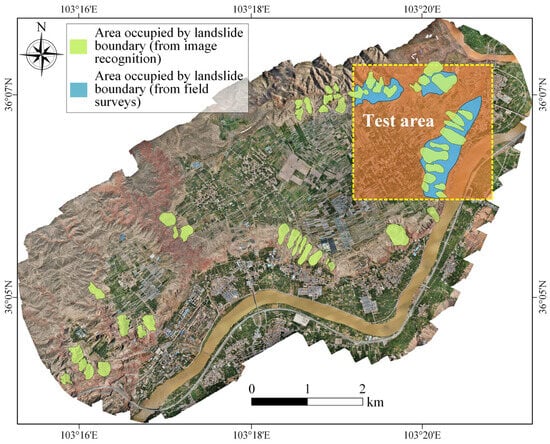 The Heifangtai Terrace, a T4 river terrace of the Yellow River, is located in Yongjing County, Gansu, China (see Figure 6a). The studied terrace covers an area of approximately 15 km2 and the topography is relatively gentle; the elevation at this site increases along the NE-SW direction and the slope ranges from 2° to 5° while its margins feature steeper gradients ranging from 25° to 45°. The elevation of this terrace varies in a range of 1664–1754 m [60]. The subsurface stratigraphic profile of this terrace, arranged from top to bottom, includes the Malan Loess layer with a thickness of 30 m to 50 m, a clay layer with a thickness of 3 m to 20 m, a gravel layer with a thickness of 1 m to 10 m, and, finally, the underlying bedrock [60]. Among them, the Malan Loess exhibits collapsibility, characterized by metastable microstructures with weakly cemented particles and open pore networks that undergo catastrophic fabric reorganization upon hydration, manifested through rapid strength degradation and self-accelerating hydrocompaction processes—a critical mechanism triggering cascading geological hazards in engineering contexts. A large amount of water has been pumped from the Yellow River for agricultural irrigation on this terrace since the 1960s [61]. As a consequence, the groundwater level in this terrace has been increased dramatically and the load-bearing capacity of the loess at the basal zone has been reduced due to saturation; thus, lots of ground surface cracks and loess landslides have been observed along the terrace edge. According to the report published by the local government, more than 200 loess landslides have occurred in the study area, which has affected an area of approximately 11 km2, caused 41 deaths, and destroyed hundreds of houses; the direct economic loss has been more than 1.22 billion RMB (https://www.gsyongjing.gov.cn/yjx/zfxxgk/fdzdgknr/zdmsxx/CZZJZDJC/art/2022/art_de6b2102feff45a8a721156fc8f4cde3.html (accessed on 1 January 2024)). Thus, the accurate identification of the potential landslides in the study terrace plays a vital role in the reducing and mitigation of landslide risk. It should also be noted that the vegetation cover in the study area is mainly composed of sparse and low shrubs due to the arid climate conditions [61]. As such, the ground surface cracks and other landslide features in the study area could be captured in the UAV images collected, making this terrace a suitable area for applying the image-analysis-based landslide identification framework proposed.