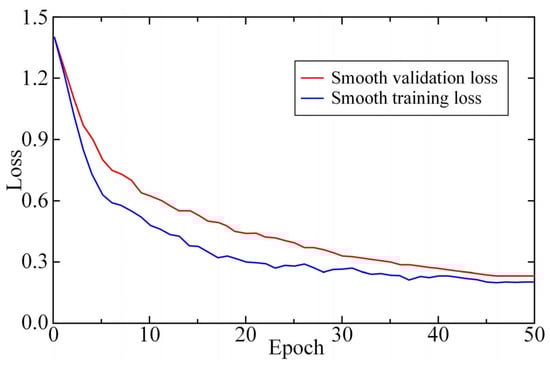 Following the procedure of the deep transfer learning strategy [55], the images in Database A were first imported to the platform of the GPU-based TensorFlow-Keras, and these sample images were trained for 20 epochs utilizing RetinaNet, with a weight decay of 0.0001 and the momentum of 0.9 [11,53]. The outcome of this pre-training process was a pre-trained ground surface crack recognition model. It is noted that the model training in this paper was executed on a desktop equipped with a 64.0 GB RAM, an Intel® Core™ i9-7940X CPU running at 3.10 GHz, and two NVIDIA GeoForce GTX 1080 Ti GPUs. As discussed above, the preliminary backbone feature extraction network (ResNet) of the ground surface cracks could be obtained through this pre-training, and the feature layers in the obtained ResNet mainly consist of two parts: one is the feature transform layer (known as the convolution layer) and the other one is the classifier layer (known as the full connection layer). In general, the feature transform layer exhibits a weak correlation with the site-specific image characteristics. Thus, the convolution layer in the ResNet of the pre-trained ground surface crack recognition model, including its network structure and connection parameters, was retained, while the fully connected layer was removed. Subsequently, the sample images from Database B and the processed ResNet were imported into the GPU-based TensorFlow-Keras platform, where the input information was re-trained using RetinaNet. During the fine-tuning phase, the maximum number of training epochs was set to 100, and an early stopping strategy [67] was employed to prevent overfitting and ensure training halted at the optimal performance point. Specifically, the patience was set to 5, and the delta was set to 0.005, meaning that training stopped if the validation loss did not improve by at least 0.005 for five consecutive epochs. This approach effectively mitigated overfitting while promoting sufficient convergence. Figure 11 illustrates the training and validation loss curves during the fine-tuning phase. It can be observed that both losses declined rapidly in the initial stages and stabilized after approximately 25 epochs. The model reached its best performance at the 45th epoch, with early stopping triggered at the 50th epoch, indicating full convergence by this point. Through this re-training process, the surface crack recognition model, initially pre-trained with Database A, was fine-tuned using Database B via RetinaNet, yielding an enhanced ground surface crack recognition model.