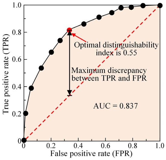 One should be informed that in the context of object recognition, a candidate object is often bracketed by a frame and a score ranging from 0 to 1.0 is assigned. If the score assigned is greater than the distinguishability index, which is a threshold value that is widely employed in image recognition analysis for separating target objects and non-target objects [11,68], the candidate object will be recognized as the target object. As such, the application results of the trained ground surface crack recognition model could be strongly affected by the distinguishability index. For a specified distinguishability index, when a given image is taken as an input to the obtained ground surface crack recognition model, there exist four possibilities: (1) if there are ground surface cracks in the input image and the cracks could be recognized, it is true-positive (TP); (2) if there is no surface crack in the input image and ground surface cracks could be recognized, it is false-positive (FP); (3) if there is no surface crack in the input image and no surface crack is recognized, it is true-negative (TN); and (4) if there are ground surface cracks in the input image and no surface crack is recognized, it is false-negative (FN). Through counting the numbers of TP, FP, TN, and FN events in the testing images (adopted in the re-training of the crack recognition model, Database B), the true positive rate (TPR) and the false positive rate (FPR) can be calculated. The readers are referred to Greiner et al. [69] and Cheng et al. [11] for more information on the calculation of these two rates. According to the calculated values of TPR and FPR for different possible distinguishability indexes, a receiver operating characteristic (ROC) curve is readily plotted, as illustrated in Figure 12. In general, a model with an area under the curve (AUC) value greater than 0.7 could be deemed a good model [69]. Here, the AUC value of the trained ground surface crack recognition model was 0.837, which indicates that the developed image recognition model has good accuracy in the recognition of ground surface cracks.