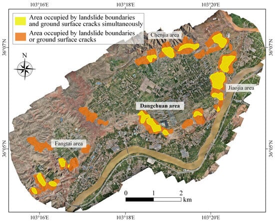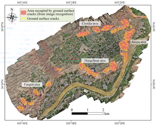 For an accurate landslide diagnosis of the study area (i.e., the Heifangtai Terrace), the landslide boundaries and ground surface cracks, recognized in Section 3.2 and Section 3.3, respectively, are fused in this section using the Boolean operation. Then, the landslide identification results are verified through comparisons with field survey results and historical landslides in this area. As shown in Figure 10, the landslide areas and boundaries, recognized with the object-oriented image analyses, are mainly distributed along the edge of the Heifangtai Terrace. In reference to Xu et al. [61], the occurrence of landslides in the terrace is mainly triggered by the dramatic increase in the groundwater level due to the agricultural irrigation on the terrace; the increase in the groundwater level could have led to the softening and deformation of the loess layer. Further, the elevation difference of the terrain around the edge of the terrace could have provided an inherent susceptible condition for the landslide occurrence. Thus, the landslides in the study area would be mainly distributed along the edge of the terrace. Indeed, most of the historical landslides that occurred in this area were distributed along the edge of the terrace [61]. In other words, the landslide area and boundary recognition results are consistent with the state of knowledge on landslide occurrences in the study area. The plots in Figure 10 also show that the landslides in the terrace mainly occurred in the Dangchuan, Jiaojia, Chenjia, and Fangtai areas, and such an observation is also consistent with the historical landslide events reported in this area.