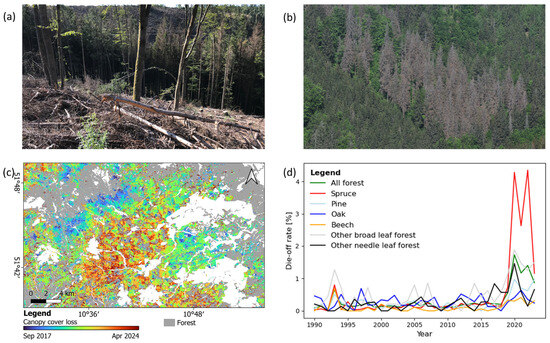 Different forms of canopy cover loss in spruce trees of Germany. (a) Canopy cover loss with clear cuts in Germany. (b) Standing spruce trees with canopy cover loss. Photos (a,b) were taken by Frank Thonfeld. (c) Canopy cover loss in the Harz Forest in between September 2017 and April 2024. (d) Die-off rate of different German forests types since 1990. These data are based on the annual forest condition survey conducted by the Federal Ministry of Food and Agriculture (BMEL) [16].