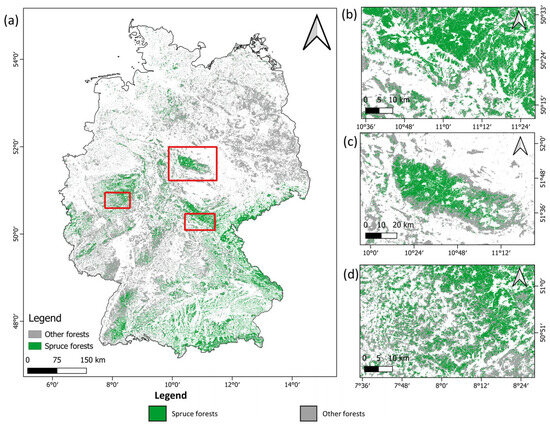 (a) Forest map of Germany with study areas marked with red box. The study areas, Siegen, Harz and Frankenwald are shown in red rectangular boxes from left to right, respectively; (b) Study area Frankenwald; (c) Study area Harz; (d) Study area Siegen. The Dominant Tree Species for Germany 2018 dataset [61] was used for mapping spruce forests (green) and other forests (gray).