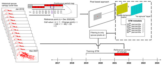 An STM window and a “no spruce” window of size can be generated for every pixel in the image. However, an additional filtering step was performed to only consider the STM and “no spruce” data of those pixels which are spruce forest at the reference time point. This step ensures that the STM and “no spruce” data are only processed for relevant pixels and not of pixels which have no spruce forests. Pixels with canopy cover loss before the reference time point are excluded, as it is unlikely that these areas have developed forests that can experience canopy cover loss again. The total number of pixels after filtering is denoted by .