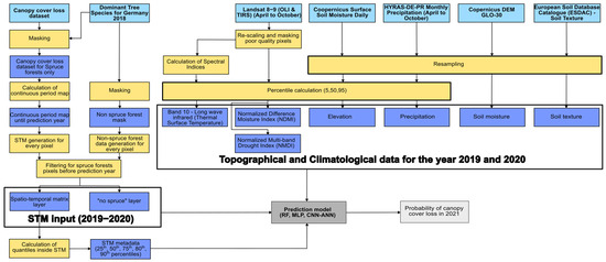 Schematic diagram of preprocessing, inputs and outputs of prediction model for the period of 2021 loss. All input datasets are shown in light blue, intermediary pre-processing steps in yellow, intermediary data products in dark blue, forecasting model in dark grey and final output in light grey. Abbreviations STM: Spatio-temporal matrix; OLI: Operational Land Imager; TIRS: Thermal Infrared Sensor; HYRAS-DE-PR: Hydrometeorological raster datasets—Deutschland—precipitation sums in mm; DEM GLO-30: Global digital elevation model 30 m; RF: Random forest, MLP: Multi-layer perceptron; CNN-ANN: Convolutional Neural Network–Artificial Neural Network.