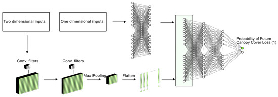 Most research for modeling and prediction in forests extensively uses random forest (RF) due to its ease and minimal computation requirements [79]. Simple deep neural networks such as Multi-Layer Perceptron (MLP) are also popular [59]. Now, with accelerated computing resources and speed with the use of graphical processing units (GPUs), and the formation of high-performance data analytics (HPDA) systems, there has been a resurgence of neural networks which have led to better algorithms and neural network designs [80]. The two-dimensional nature of the STM can be optimized by using a Convolution Neural Network (CNN), while the environmental parameters and the STM metadata can be put through a simple Artificial Neural Network (ANN). We tested combining the approaches to create a hybrid CNN-ANN model by concatenating the outputs of the CNN and ANN model in a combined model produced in keras library [81], as shown in Figure 5. The model architecture is explained in Table 3. The ‘relu’ activation function was used in all layers due to its compatibility with deep neural networks, except for the final layer where a ‘sigmoid’ activation function was used to give the output in the form of a probability for each class. The results of this model were compared with results of MLP and RF from the scikit-learn library [82] on the STM prediction model.