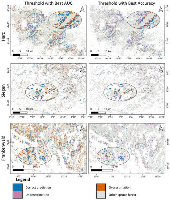 Maps of predicted canopy cover loss, 2022, with different thresholds (best AUC and best Accuracy) for different regions.