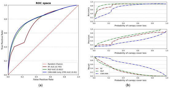 The results of models trained in RF, MLP and a custom CNN-ANN hybrid model for the region of Frankenwald—trained on 2021 loss and validated with data of 2022, with STM data only as predictors—are shown in Table 7. The ROC curve representation along with the accuracy, precision and recall at different probability thresholds are depicted in Figure 7. The CNN-ANN model shows the best performance according to AUC metrics and has the best precision. Recall is the best in RF; however, accuracy is the worst.