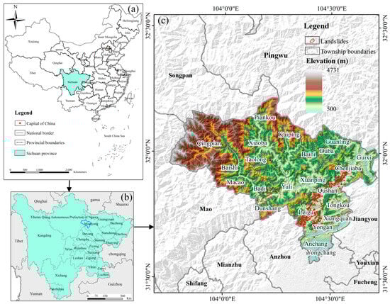 Location of the study area. (a) Location of Sichuan Province; (b) location of Mianyang City; (c) location of Beichuan.