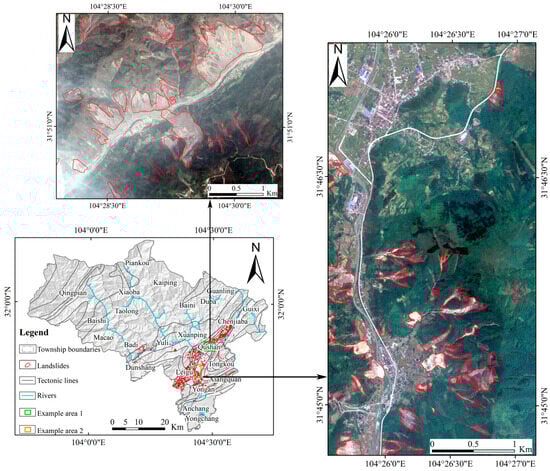 Beichuan Qiang Autonomous County is located in the transition zone from the northwestern edge of the Sichuan Basin to the western Sichuan Plateau (Figure 1). It falls under the jurisdiction of Mianyang City and has a land area of 3082.72 km2 []. The county borders Jiangyou City, Anzhou District, Mao County, Songpan County, and Pingwu County, and is situated in the Longmen Mountain region, a transitional area between the Sichuan Basin and the Qinghai–Tibet Plateau. Tectonically, it is located at the junction of the front and back ranges of the Longmen Mountains []. The entire area is mountainous, characterized by long gullies, steep slopes, and a complex geological environment. The Yingxiu-Beichuan fault, which triggered the Wenchuan earthquake, lies in the southeastern part of the study area. Along the fault zone, Silurian phyllite and sandstone, Carboniferous carbonate rocks, and loose Quaternary deposits are widely exposed on both sides of rivers and valleys. These highly weathered rocks provide abundant material sources for geological disasters. Moreover, the area is part of the well-known Lutou Mountain heavy rainfall region, which experiences abundant precipitation. The geographical location, topography, geomorphology, and geological and tectonic conditions of the study area make landslides highly frequent in this region.
