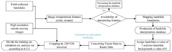 Using high-resolution Google Earth images with a spatial resolution of 0.5 m, combined with the spectral characteristics of landslides in the study area, we applied visual interpretation to construct landslide identification sample data. The landslide contours were used as boundaries to outline landslide surface vector data and generate label data. The process of sample library production included vector editing, field assignment, vector-to-raster conversion, label generation, data segmentation, and sample dataset division. The detailed process of sample library production is shown in Figure 3.