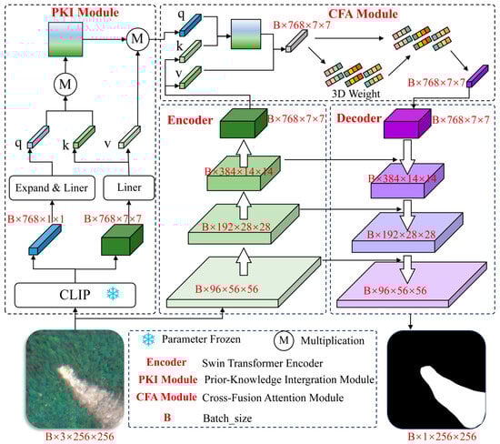 Next, the PKI (Prior Knowledge Integration) module is introduced to effectively integrate the local and global information extracted by CLIP. The core equation of PKI is shown in Equation (1). By incorporating domain-specific knowledge about landslides, such as common deformation patterns or geological characteristics, the PKI module generates a priori knowledge tailored to landslide analysis. This step ensures that the model focuses on the most relevant features for landslide identification.