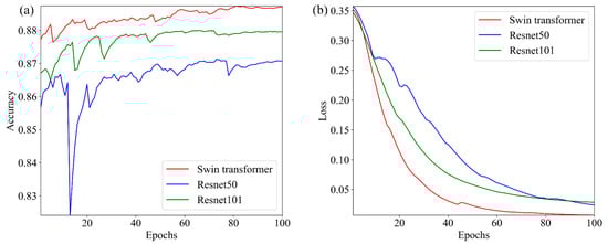 The Swin Transformer model demonstrates significant performance advantages, particularly in comparison to the classic ResNet50 and ResNet101 models []. From the perspective of validation accuracy, the accuracy curve of the Swin Transformer exhibits a steady upward trend, quickly surpassing the baseline performance of ResNet50. Moreover, as training progresses, it further widens the gap with ResNet101, eventually stabilizing at a relatively high accuracy level. This improvement highlights the Swin Transformer’s remarkable advancements in feature extraction and model generalization capabilities.