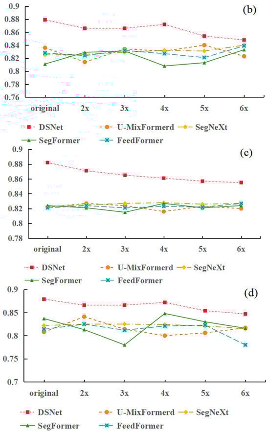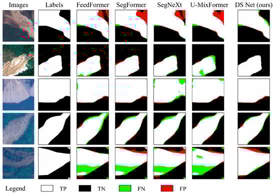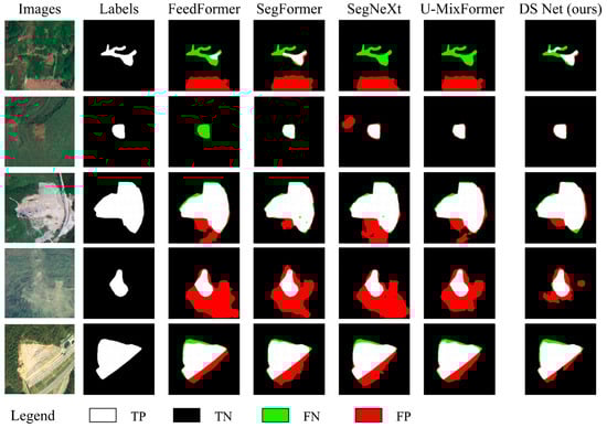 To evaluate the performance of the DS Net-based landslide recognition model more objectively, we incorporated findings from the backbone network ablation experiments, which showed that CNN-based models significantly underperformed compared to the Swin Transformer. Therefore, four representative efficient semantic segmentation models were selected for comparison in this study: 1. SegFormer [] uses a hierarchical transformer encoder and a lightweight MLP decoder to significantly reduce computational complexity while maintaining accuracy. 2. SegNeXt [] innovatively fuses convolution and attention mechanisms, and its Convolutional Attention Module (CAM) excels in edge preservation and detail segmentation. 3. FeedFormer [] creates the first feed-forward transformer architecture, replacing the standard attention layer with a cascading feed-forward network to dramatically increase processing speed and memory efficiency. 4. U-MixFormer [] is an improved hybrid transformer based on U-shaped architecture, which is especially suitable for complex scene segmentation tasks by optimizing local and global feature fusion. The selection of these advanced models provided a comprehensive and rigorous frame of reference for DS Net’s performance evaluation.
