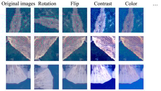Data enhancement is a powerful data processing technique that applies diverse transformations to segmented images [,], such as rotation, flipping, adding noise, and blurring [,,] (as shown in Figure 8). While it does not substantially introduce brand new data, it effectively simulates various possible changes in images under practical conditions, exponentially increasing the diversity and value of the dataset at a lower cost. Of particular importance is ensuring that corresponding labels undergo consistent transformations alongside the augmented image data. Labels are crucial in supervised learning as they guide the model to learn how to extract the correct outputs from input images. For example, if a rotation operation is applied to an image, its corresponding labels must also be rotated in the same manner to maintain the alignment between image content and label information. This synchronized transformation of labels is a critical factor in ensuring the effectiveness of data enhancement. Failure to maintain this consistency could result in the model learning incorrect information, ultimately affecting its performance.