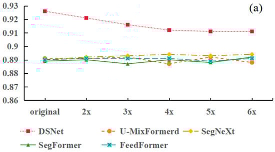 The experiments in this paper were conducted on the Windows 11 x64 Edition operating system, which provides a stable foundation with enhanced security features and performance optimizations. For deep learning frameworks and acceleration, the experiments utilize Pytorch version 2.1.1, complemented by Pytorch-CUDA version 11.8, to enable GPU acceleration, significantly enhancing model training speed. The training process is powered by an NVIDIA GeForce RTX4090 GPU with 24 GB of video memory, supporting large-scale model training and high-resolution image processing tasks. Regarding model training parameters, 100 training epochs are conducted for experiments involving the Swin Transformer and Dual-Coded Segmentation Network to thoroughly explore the model’s learning capabilities and mitigate overfitting. The batch_size is uniformly set to 8 to balance memory utilization and convergence speed. The network input consisted of remote sensing images with dimensions of 3 × 256 × 256, adhering to the standard input format required by most deep learning models. The Stochastic Gradient Descent (SGD) [] optimizer is utilized as the optimizer. During the training process, it is necessary to gradually reduce the learning rate to improve the model. In this paper, we use the callback function ReduceLROnPlateau in Pytorch, which can automatically adjust the learning rate during training and is conducive to finding a balanced position between the training speed of the model and the efficiency of the training, which is achieved by reducing the learning rate after every N training rounds. In this paper, we try different learning rates, including 1 × 10−1, 1 × 10−2, 1 × 10−3, 1 × 10−4, 1 × 10−5, and the training results confirm that the learning rate of 1 × 10−4 is the most effective. Therefore, in this paper, the initial learning rate is set to 0.0001; N is 10, i.e., if the training accuracy does not decrease after 10 rounds of training, a new learning rate is introduced into the model for training. The newly set learning rate is to reduce the size of the initial learning rate by 20%. This study quantifies the computational efficiency based on the model parameters, average training time for each epoch, and floating-point operations (FLOPs), with the experimental results detailed in Table 1.