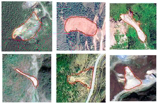 Some landslide samples from the Bijie dataset: red lines are landslide boundaries.
