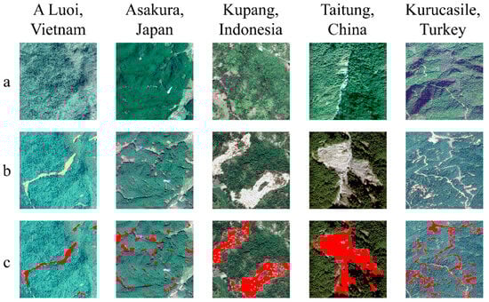 Some samples of the GVLM dataset. (a,b) Pre- and post-event imagery. (c) Landslides with red masks.