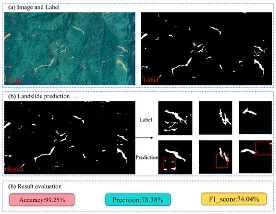This study demonstrates, in detail, the prediction results for A Luoi, Vietnam, as shown in Figure 13. DSNet effectively identified most of the landslide areas in the experimental area. DSNet still achieved excellent recognition performance under complex terrain conditions, with a precision of 78.38%, an overall accuracy of 99.25%, and an F1 score maintained at a high level of 74.04%.