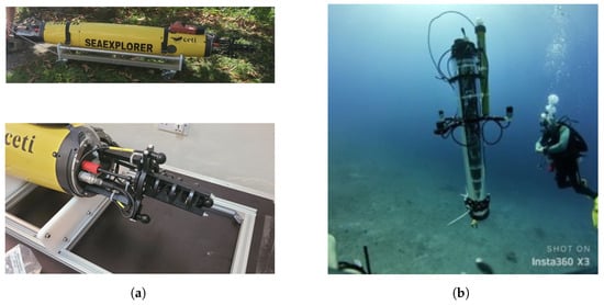 The detection and tracking of underwater targets is required for applications such as the monitoring of marine fauna [], identifying schools of fish in commercial ventures [], and detecting the prey of sperm whales (Physeter macrocephalus) for behavioral analysis []. Monitoring is carried out with autonomous floaters or gliders. Real-time analysis allows an immediate response to either report a detection event or approach the source to achieve a better signal-to-noise ratio (SNR). The important requirement in biodiversity assessment is not the localization error but the continuity of the tracks, that is, a high ratio between the duration of the track and the lifetime of the target. We consider two specific applications: (1) the monitoring of deep-sea giant squid (Architeuthis dux) by autonomous gliders to draw conclusions about the behavior of sperm whales, for which squid are a major food source, and (2) the monitoring of fish populations from a floater. The latter is necessary both for regulators, who need to set data-driven policies, and for sustainable fisheries to reduce bycatch by making fishermen aware of the location of fish schools. The first application is considered in the context of a project called CETI (Cetacean Translation Initiative), in which we have set ourselves the ambitious goal of understanding the language of sperm whales by tracking their activity and vocalizations. The second application is in a project called SOUND, where we deploy a swarm of autonomous floaters to monitor the water column in search of schools of fish. In both cases, the monitoring is performed by active acoustics, specifically, by emitting acoustic signals and analyzing their reflections to find moving targets. Images of our glider and floater platforms can be found in Figure 1a,b, respectively. In this paper, we describe our solution for target detection and localization.
