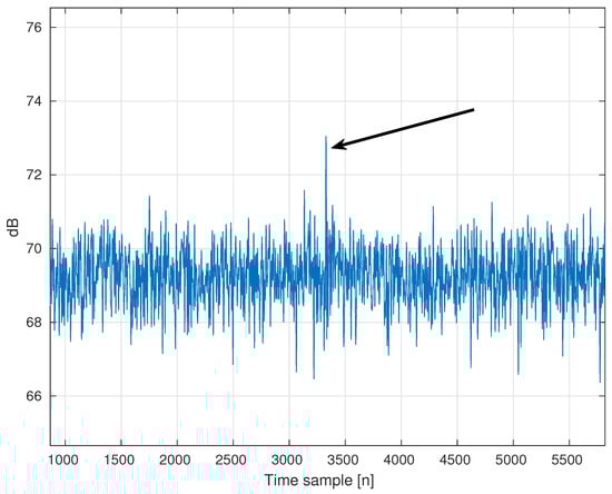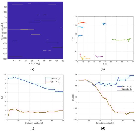We simulate a single target with an initial position of m and m and a velocity of m/s and m/s. An example of the detection and tracking results can be found in Figure 3. The binary map is shown in Figure 3a, where the yellow regions indicate the detected blobs. Figure 3b shows the track map. The solid line indicates the track that belongs to the real target, and the dotted lines represent the false tracks. Figure 3c,d show the position and velocity estimation of the target, respectively. As long as the target is large enough for the wavelength of the emitted signal (about 5 cm), the size of the target has little effect on the performance. However, speed does have an impact on the tracking. We observe a convergence of velocity after 32 emissions. Figure 4 shows an example of the samples received from the emission after beamforming. The target is marked with the arrow, and the SCR is 3 dB.