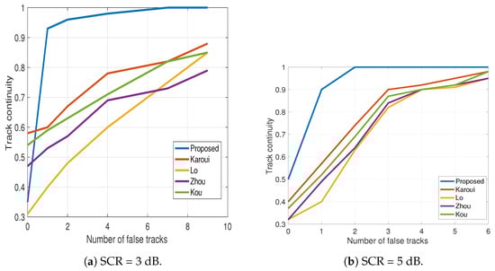 The results are shown for an SCR of 3 dB in Figure 5a and for an SCR of 5 dB in Figure 5b. We note that the results of Lo show the lowest track continuity. This is because this scheme does not merge closely spaced detections, which increases the false alarm rate and thus decreases the track continuity. We find that our method outperforms the benchmark for both tested SCR values and achieves a track continuity of more than 0.9 with less than two false traces. We find that the SCR has an impact on the tracking performance. For an SCR of 3 dB, our method achieves a track continuity of one with seven false tracks, while, for SCR of 5 dB, the same tracking continuity is achieved with two false tracks.