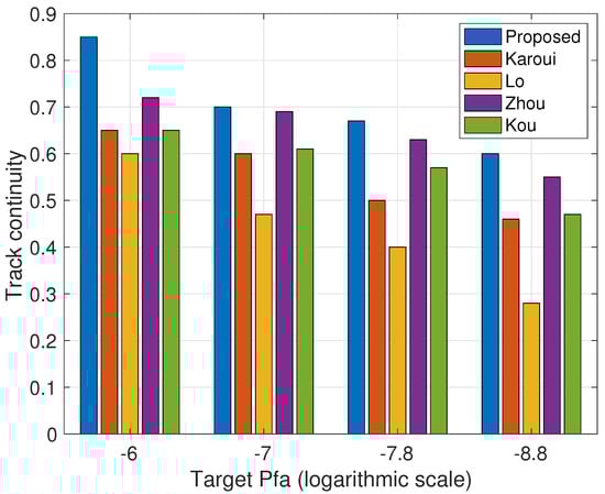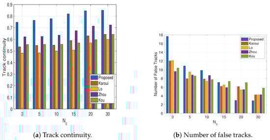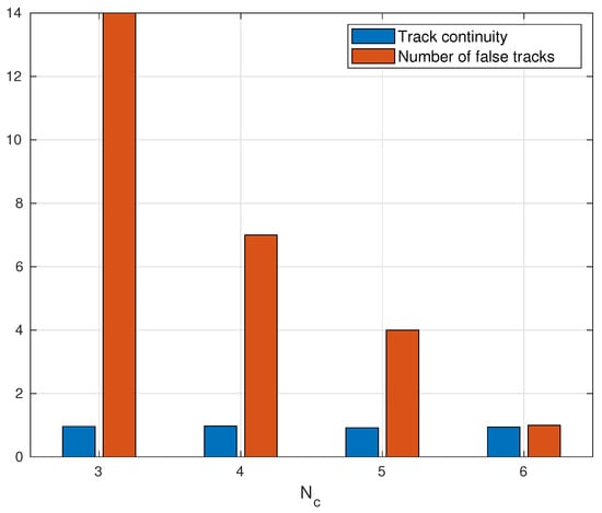 In this section, we analyze the continuity of the tracks and the number of false tracks for different values of the track confirmation thresholds, . In this analysis, we set the detection threshold to 0.2 and the SCR to 3 dB. The results are shown in Figure 6. When the confirmation threshold is small, more tracks are validated, and the number of false tracks increases. However, the track associated with the true target is reported with less validation time. When the confirmation threshold is high, the validation time is also high, and consequently the number of false tracks decreases, but the track associated with the true target is reported with a higher latency. As expected, increasing the confirmation threshold does not affect the continuity of the tracks but rather reduces the number of false tracks.