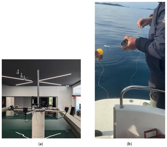 Pictures from the sea experiment. (a) The 4-element hydrophone array with the projector positioned above it. (b) A picture of one of the tested fish. The GPS and the surface float attached to it can be seen in the water. Hydrophones and projectors are installed above the floater’s body to reduce interference.