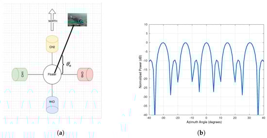 The measurements of all elements to a reference point on the floater were fed into the multidimensional scaling (MDS) algorithm [] to obtain a 3D estimate of the position of the array. A schematic representation of our system can be found in Figure 8a, where the hydrophones are labeled ch1 to ch4. The positions of ch1, ch2, ch3, and ch4 are (−38.5, 0), (0, 39.5), (40.5, 0), and (0, −40.5), respectively. The effective beam pattern of this constellation is shown in Figure 8b. The figure shows that due to the small array and small aperture resulting from the limitations of the floater platform, large ambiguities occur in the azimuth cut. The beamwidth is about 5 degrees (3 dB beam), but the spatial attenuation due to beamforming is at most 25 dB. This means that a large reflector can distract the detector from the actual target, and multiple targets can be displayed as interrupted tracks.