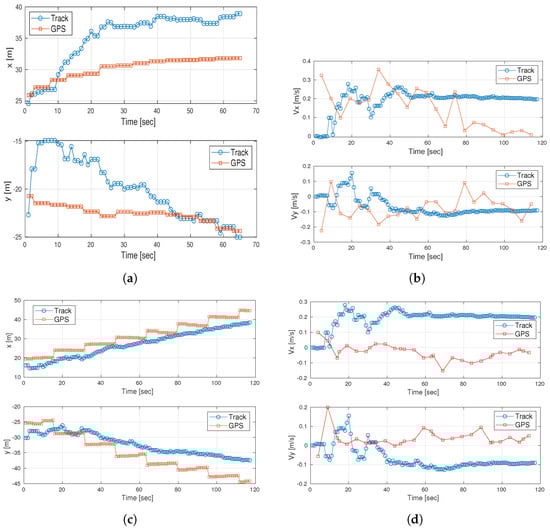 Track results versus GPS ground truth data. Results are shown for the X-Y coordinates. (a) Exp 2: track of horizontal location of fish #1. (b) Exp 2: track of speed of fish #1. (c) Exp 2: track of horizontal location of fish #2. (d) Exp 2: track of speed of fish #2.
