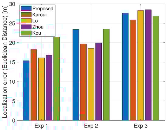 The results in terms of the Euclidean distance to the GPS ground truth measurements across all experimental sessions are shown in Figure 11 for . Here, only the true tracks are considered, and the localization error is calculated as an average across the track of observations. We find that the Euclidean error remains roughly the same between Exp 1 and Exp 2, while the error increases at Exp 3. This is because in the latter, the fish crossed each other, resulting in track intersections. There is no significant advantage for any of the explored methods, as only valid tracks were considered.