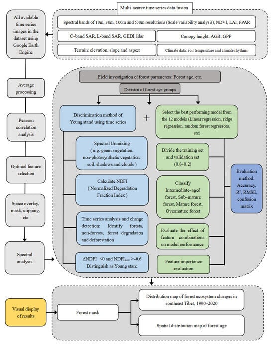 Roadmap for research. This map shows the process of estimating forest age in the forest ecosystem of Southeast Tibet, specifically as follows: Firstly, we obtain spectral bands covering different resolutions, a metadata set of multiple radar data, and related terrain, climate, vegetation, and other product data (covering all available time periods) to extract spatiotemporal information. Then, spectroscopic analysis of forest age at different scales is conducted to determine suitable spatial scales and to explore the link between forest age and various factors. Preprocessing steps included data fusion, mean calculations to reduce noise, and feature selection. Field surveys were then conducted and categorized by age group. Young forests were identified using time-series methods, and a CODED algorithm was used to integrate multiple techniques to categorize forest-cover change types from 1990 to 2020, clarifying the distribution of young forests. Other age groups were classified using machine learning, and 12 regression models were evaluated comprehensively, with the best model selected for forest age estimation. The effects of feature combinations were refined to optimize the model structure. Other age groups were then spatially classified using machine-learning models. Finally, the distribution was mapped, and the results were visualized and systematically assessed using a variety of indicators.