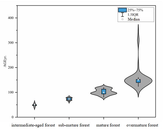 Forest age groups. The chart shows the distribution of biological age (AGEyr.) for different forest age groups (intermediate-aged forest, sub-mature forest, mature forest, and overmature forest). The data distribution is illustrated using a violin diagram, where blue boxes represent the interquartile range (IQR) from 25% to 75%, black lines represent 1.5 times the IQR, and hollow circles indicate the median.