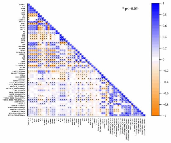 In this study, we analyzed the Pearson correlation between forest age (AGEyr) and multiple ecological and biomass-related variables using data from all field sampling points, with a significance level set at p < 0.05. The results showed a significant correlation between forest age and several variables (Figure 4). These variables include tree trunk biomass per hectare (STEM_MASSt.DM/ha), net primary productivity of branches (BRANCH_NPPt.DM/ha/yr.), root mass (ROOT_MASSt/ha), total tree mass (TOTAL_TREE_MASSt.DM/ha), volume (VOLUMEm3/ha), leaf-area index (TREE-LAI), shrub mass (SHRUB-MASSt/ha), average annual temperature (AMT), seasonal temperature change (STS), annual temperature range (TARa), near-infrared reflectivity (NIR), total primary productivity (GPP), HHLSAR, and HVLSAR.