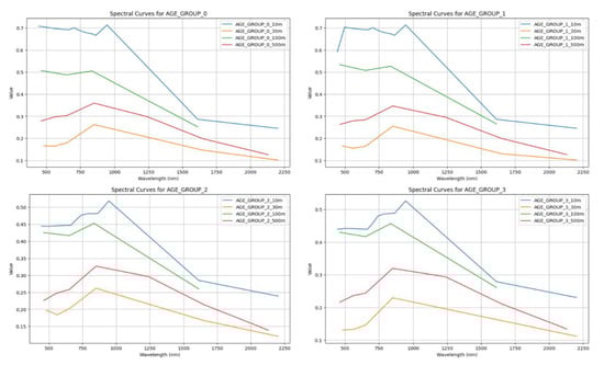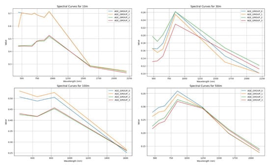 The spectral data we use come from different satellite sensors (such as 10 m of Sentinel-2 MSI, 30 m of Landsat series, 100 m of PROBA-V, and 500 m of MOD09A1), and the spatial resolutions of these sensors are different. The data from different sensors vary in spectral characteristics and spatial resolution. From Figure 5, it is evident that the spectral curves of different forest age groups exhibit distinct variations across various spatial resolutions while also sharing certain common characteristics. Specifically, significant differences in spectral reflectance are observed in specific wavelength ranges, which can be identified at different spatial resolutions. These variations provide a robust basis for distinguishing between forest age groups, further confirming the feasibility of utilizing remote-sensing spectral properties for forest age regression studies.