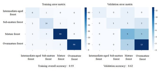To evaluate the accuracy of the proposed method in this study, we first used R2 (coefficient of determination) and root mean square error (RMSE) to assess the regression performance of the regression model, and then used accuracy and confusion matrices to evaluate the accuracy of forest age group classification [].
