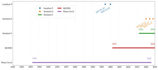 Remote sensing imagery included optical satellite images (Landsat-5, Sentinel-2, and MODIS) and microwave radar data (Sentinel-1) (Figure 2). Image collection and analysis were conducted using the Google Earth Engine (GEE) platform. Landsat-5 data were obtained from the LANDSAT/LT05/C02/T1 surface reflectance dataset, which has been atmospherically corrected. Sentinel-2 images were sourced from the COPERNICUS/S2_SR_HARMONIZED dataset, processed using the sen2cor correction algorithm. MODIS data (MOD13Q1 V6.1) provided NDVI values from 2001 to 2024 (totaling 552 scenes). Sentinel-1 SAR images were derived from the COPERNICUS/S1_GRD dataset, calibrated and geometrically corrected (422 scenes, 2016–2024).