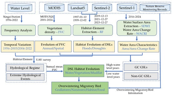 Figure 3 presents the overall methodological workflow of this study. First, remote sensing imagery and water level records from key hydrological stations were systematically collected and processed. A frequency analysis of the Xingzi station’s water level time series was then performed to characterize the hydrological regime of the DSLs. Using optical remote sensing data, habitat elements and vegetation cover were extracted, together with the water level analysis, employed to investigate the effects of altered hydrological regimes and extreme hydrological events on wetland habitat dynamics. Concurrently, microwave remote sensing images were utilized to identify the lake’s water area extent and calculate the water area change rate. By comparing the evolutionary differences in the underlying surfaces of GC DSLs and non-GC DSLs, the impact of artificial regulation on wetland habitat evolution was evaluated. Finally, incorporating monitoring data from the nature reserve, the study evaluated how shifts in habitat configuration disturb the survival and roosting behavior of overwintering waterbirds.
