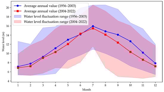 Monthly average water levels at the Xingzi station for 1956–2003 and 2004–2022.