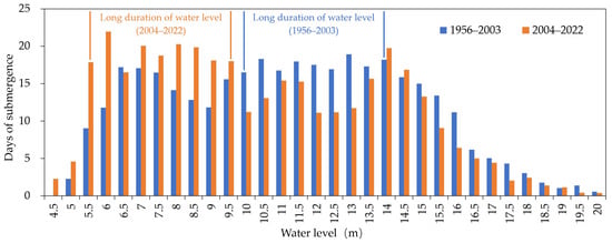To analyze the hydrological regimes of the basin, a frequency analysis of daily mean water levels was conducted for two periods: 1956–2003 and 2004–2022. The analysis used 0.5 m intervals, as shown in Figure 5. For the period 1956–2003, the water level range of 13.0–13.5 m showed the longest persistence at 18.9 days. Extended-duration levels were primarily distributed between 10.0 and 14.0 m. However, a marked shift occurred in the period 2004–2022. The 6.0–6.5 m range now had the greatest duration at 21.9 days. Longer-lasting levels were concentrated in the lower 5.5–9.5 m range. These findings indicate a substantial alteration in the basin’s hydrological regimes.