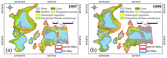 In 1998, the Yangtze Basin experienced a severe flood, which profoundly altered DSL habitats: the mudflat area surged from 62.56 km2 in 1997 to 82.75 km2 in 1999; submerged vegetation formerly concentrated in nearshore shallow zones of Banghu Lake, Dachahu Lake and Changhuchi Lake reduced and nearly disappeared. Areas of Carex spp. and Phragmites australis changed only modestly, increasing from 42.10 km2 and 22.58 km2 to 49.06 km2 and 25.11 km2, respectively; by contrast, Polygonum-Phalaris arundinacea stands declined sharply from 38.93 km2 to 25.77 km2.